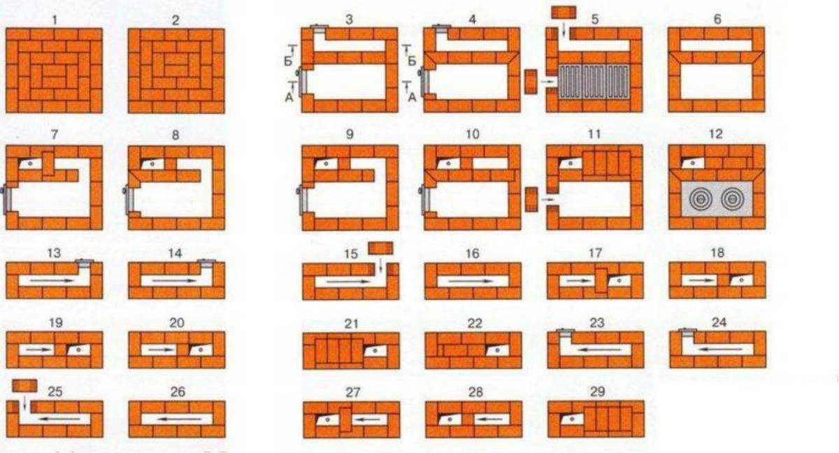 На фото таже прямой свод, решетка устроена над закрытой топкой. Дверки для топки и прочистки монтируются в переднюю стенку печи, как показано на порядовке ниже. Дополнительно на этой схеме имеется чугунная плита (варочная поверхность).