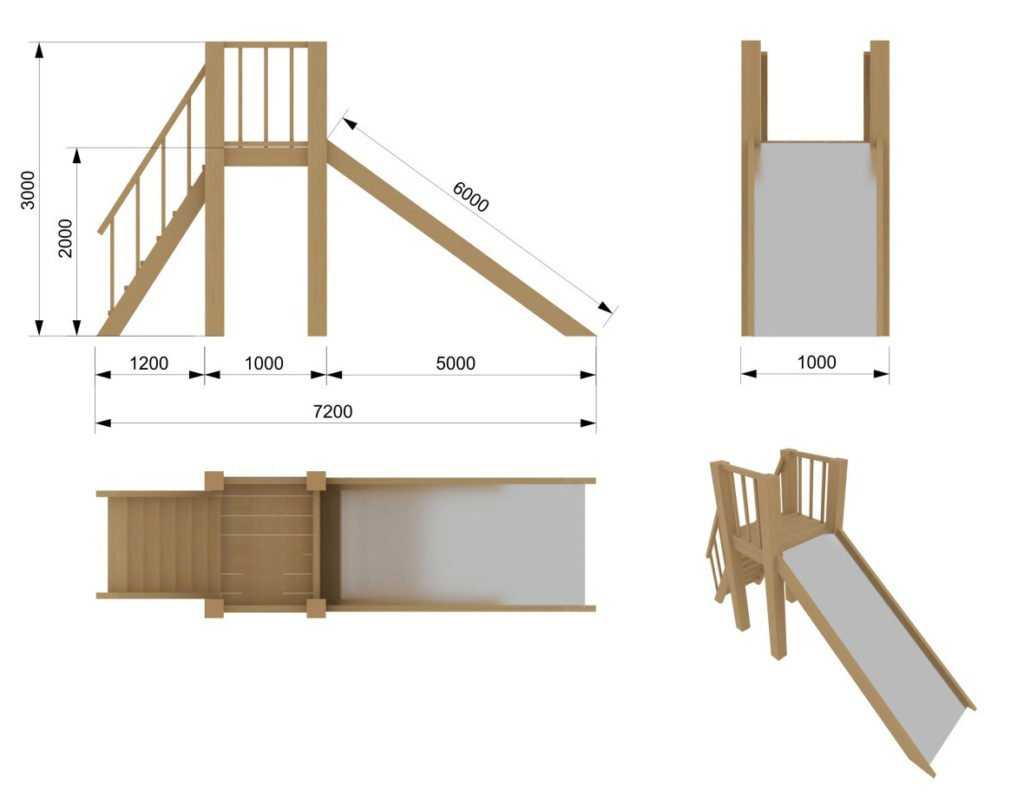 Высота этого сооружения — 3 метра, длина ската — 6 метров. Площадка расположена на расстоянии 2 метров от земли. От этих цифр зависит длина поручней, которые приделывают к конструкции по бокам спуска.