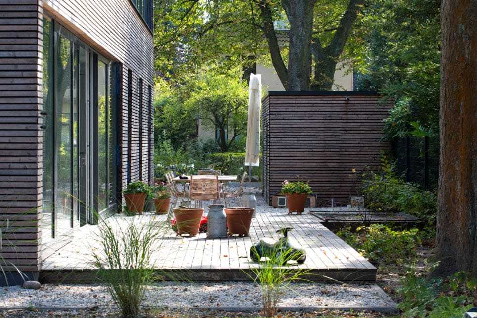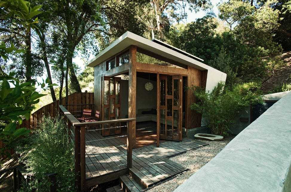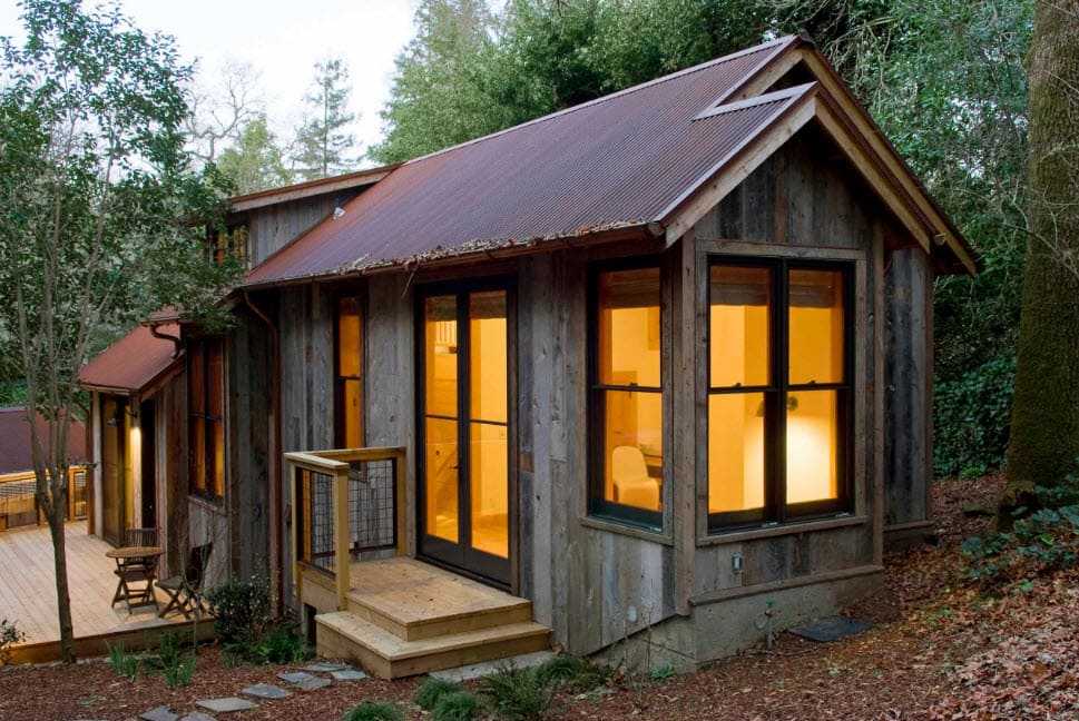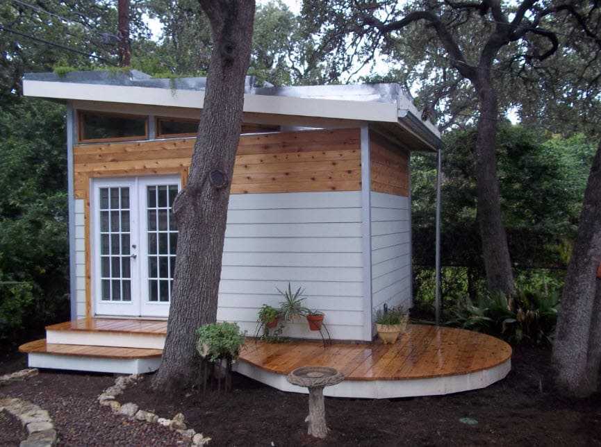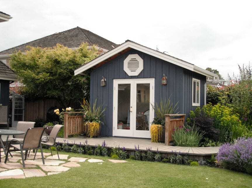 Если хозблок эксплуатируется в качестве временного складского сооружения, то впоследствии его можно будет легко переоборудовать в маленький гостиничный домик. В подобном строении получится сделать открытую веранду или террасу, поставив стол со стульями для уютного летнего времяпрепровождения с родственниками или друзьями.