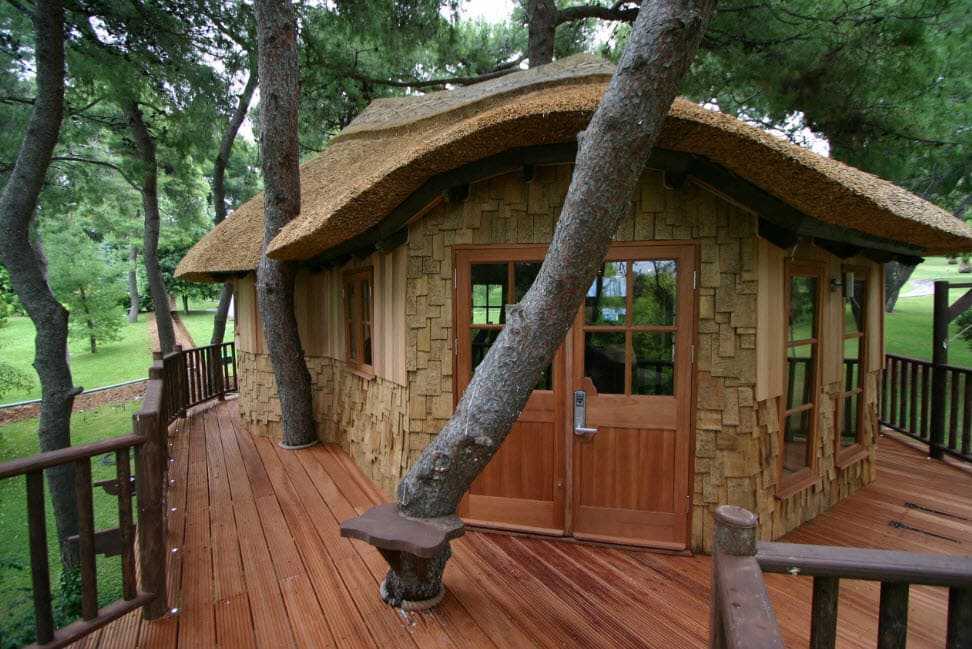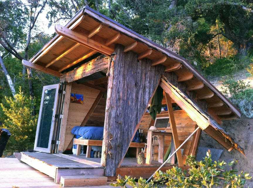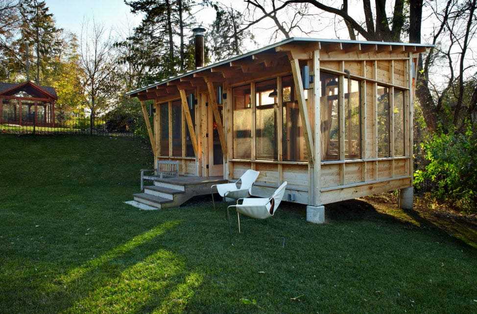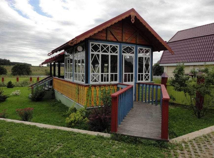 В случае создания временных складских сооружений постройка может быть переоборудована под гостиничный домик. Здесь можно организовать открытую веранду, установив стол со стульями для комфортного летнего чаепития.