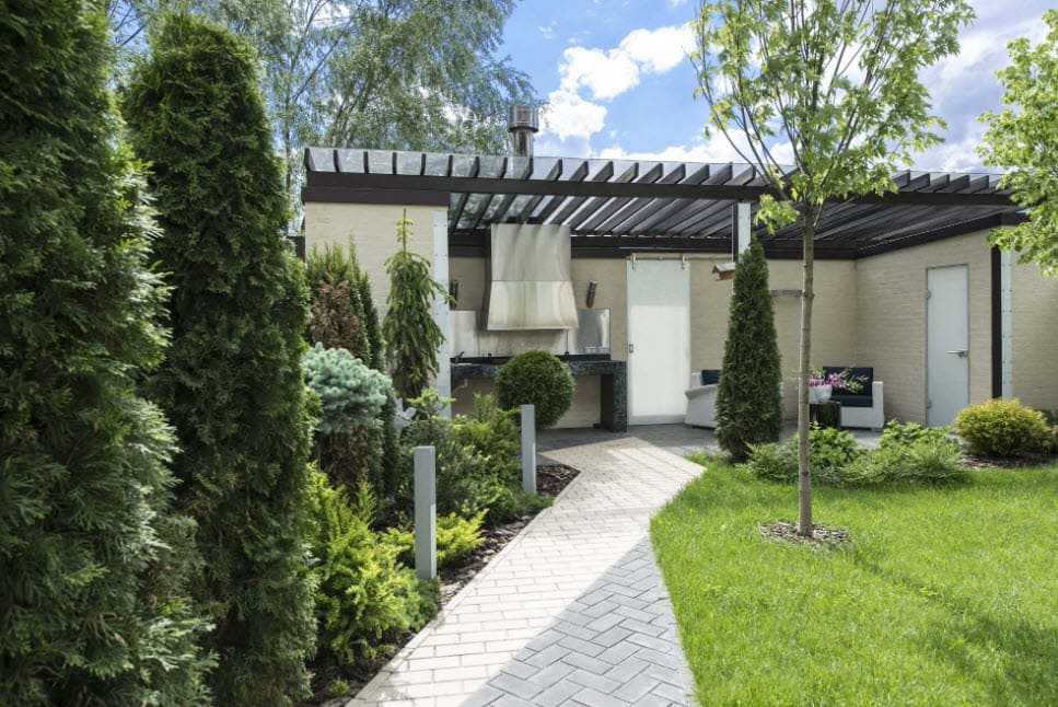 Также неплохо выглядят проекты, созданные из дерева и поликарбоната. Еще один вариант – каркас из гнутой металлической трубы, навес из профнастила и стены из перфорированных листов металла. Можно использовать сочетание профилированной трубы, бруса и сотового поликарбоната
