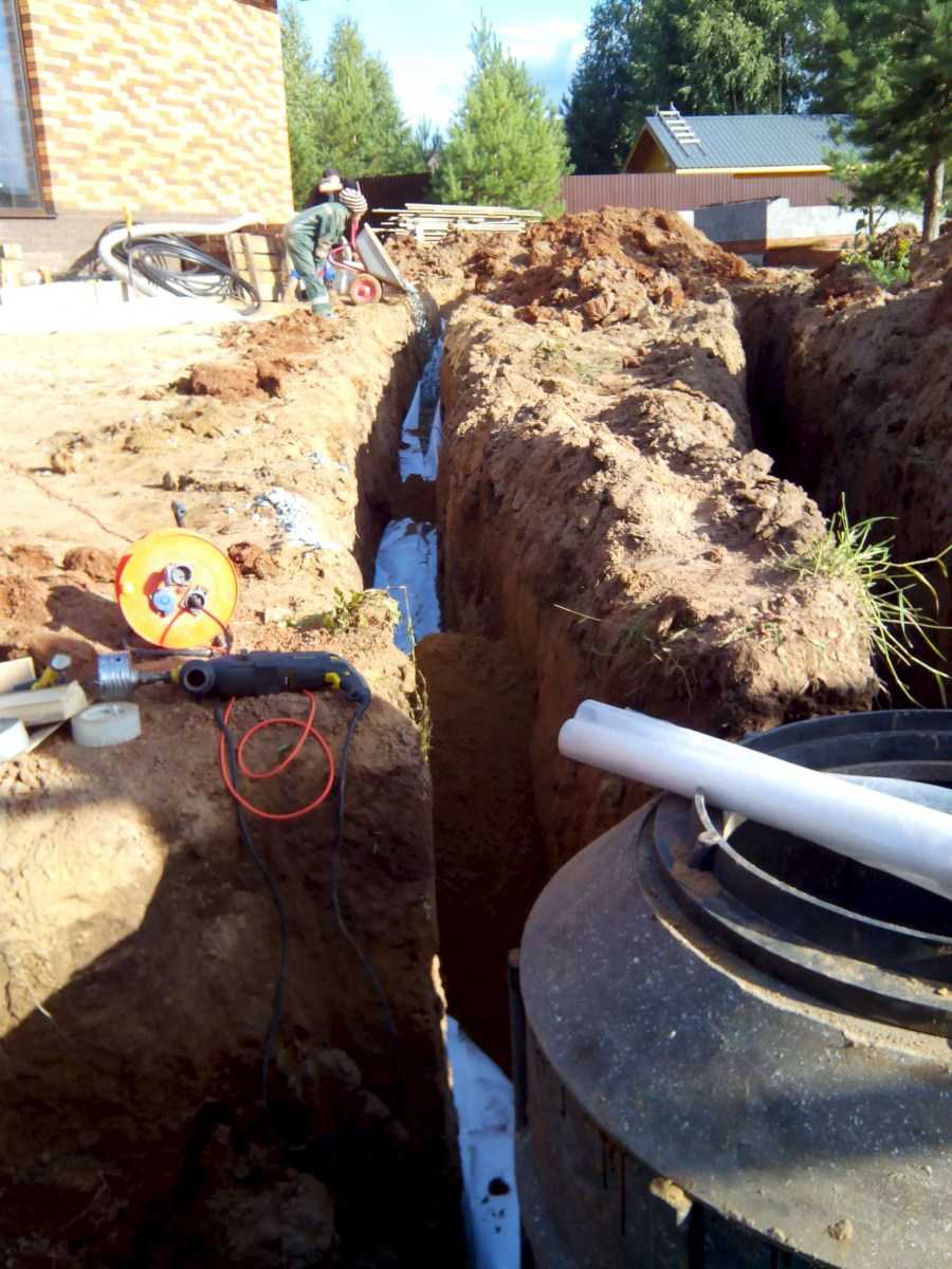 Для укладки трубопроводов нужны траншеи шириной 35–40 см и глубиной до полутора метра (зависит от уровня грунтовых вод и точки промерзания грунта). На их дне делается 15-ти сантиметровая подушка из песка со щебнем и расстилается геотекстиль, защищающий перфорацию от засорения.