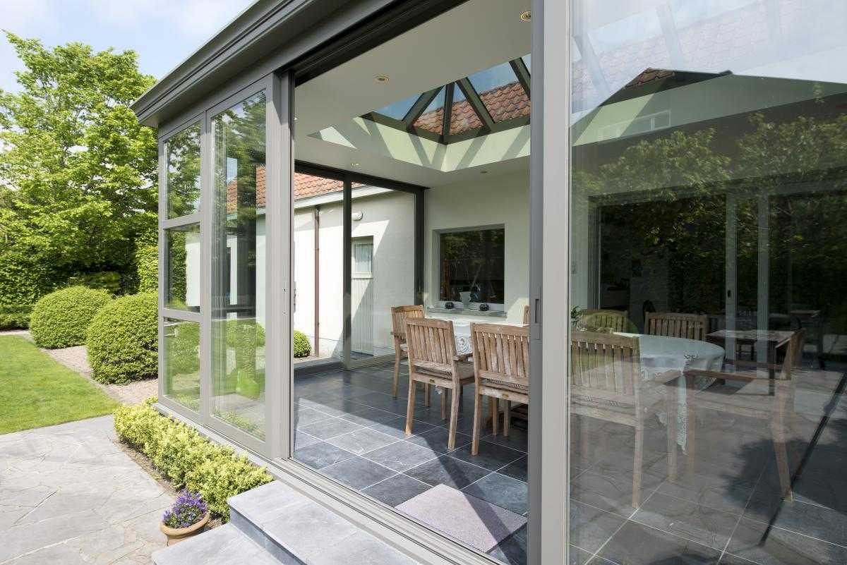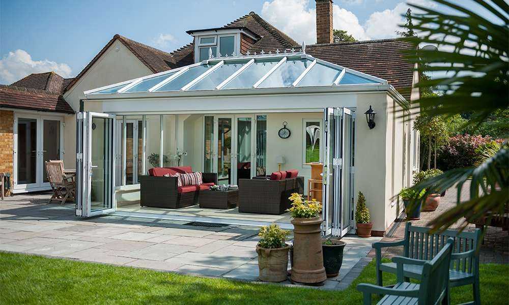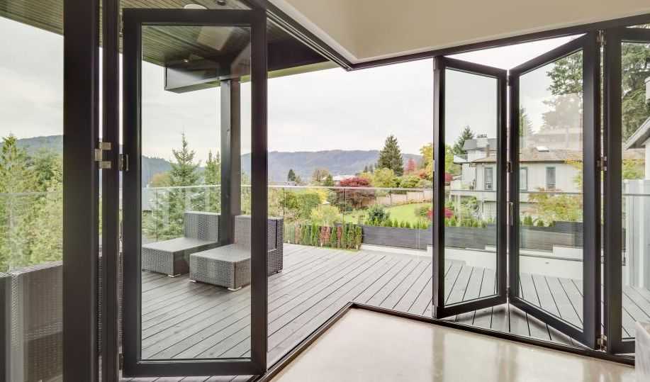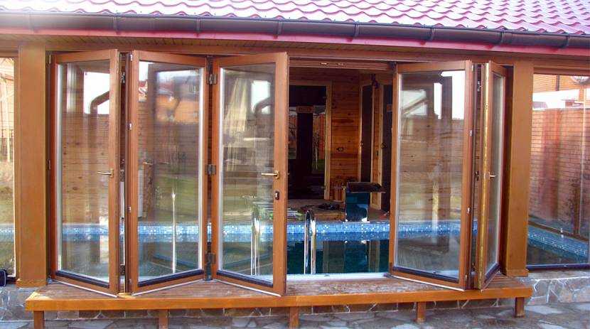 - Складная / раздвижная стеклянная дверь для веранды, террасы, беседки, которая экономит пространство.