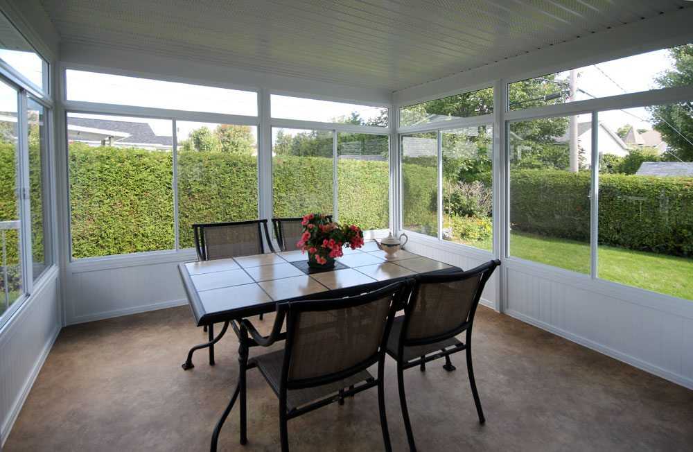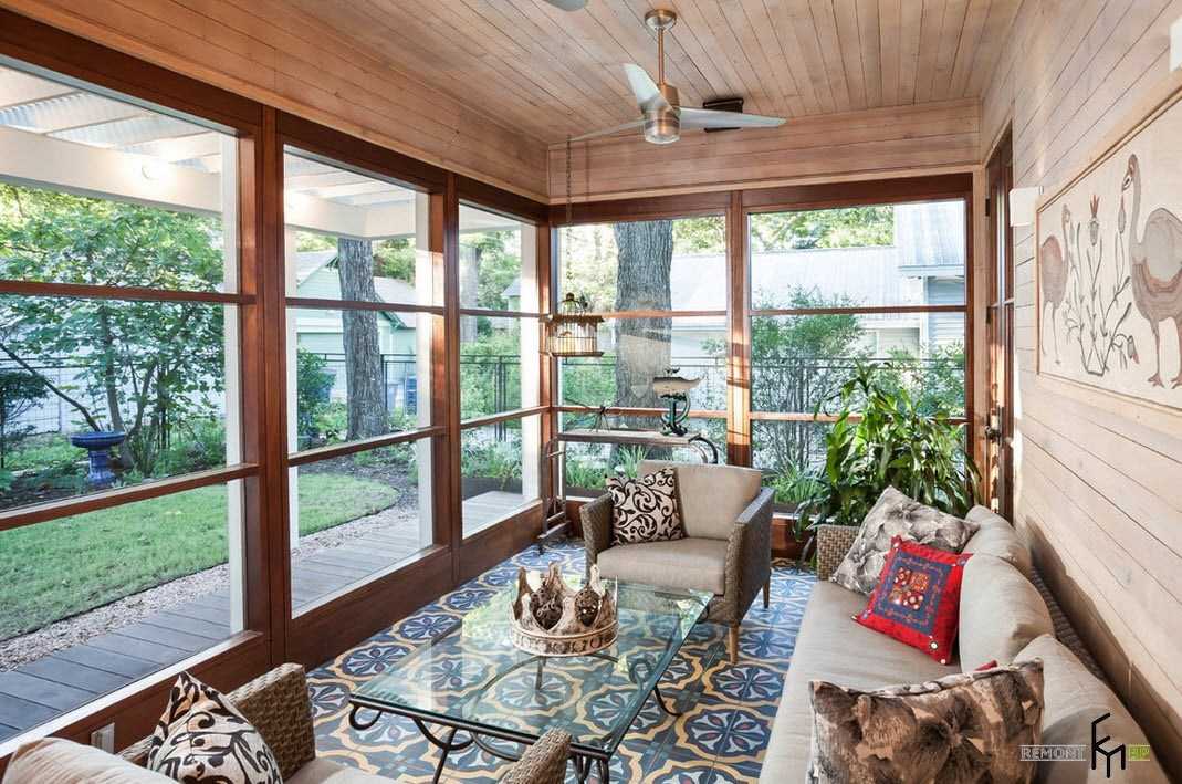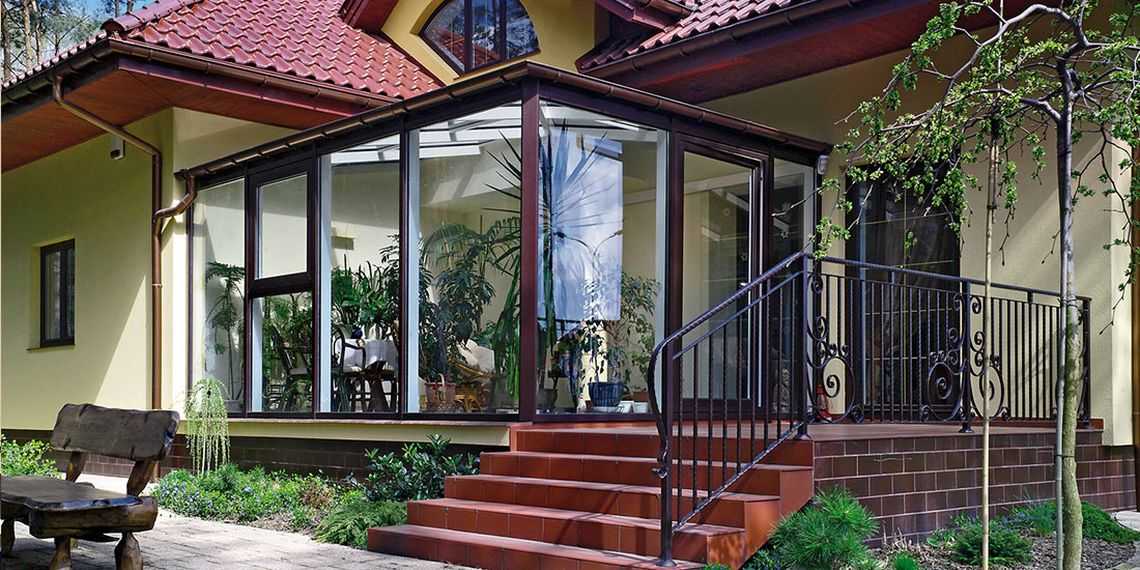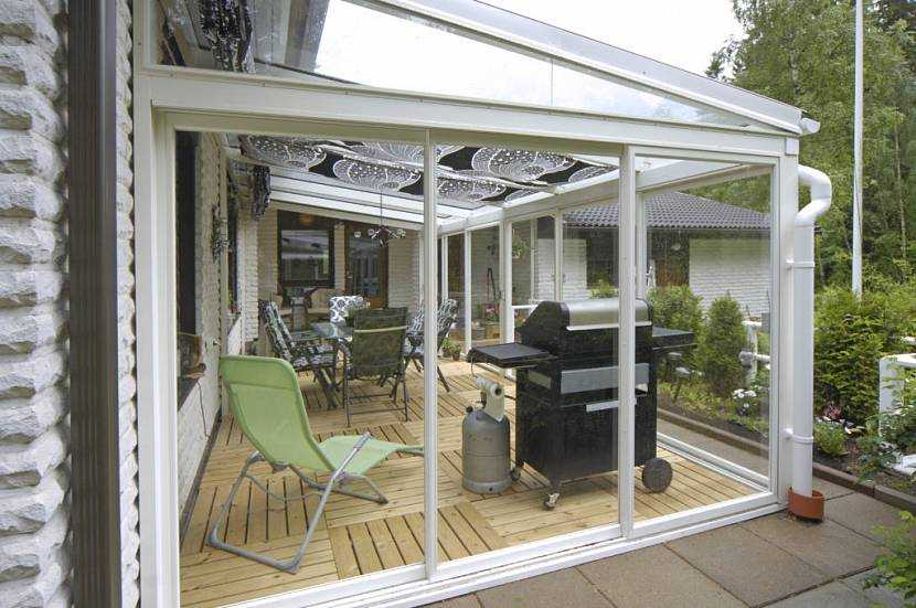 - На веранде выгодно установить стеклопакеты. Они хорошо сохраняют тепло внутри помещения и прекрасно пропускают свет снаружи. Обычно используют металлопластиковые конструкции.