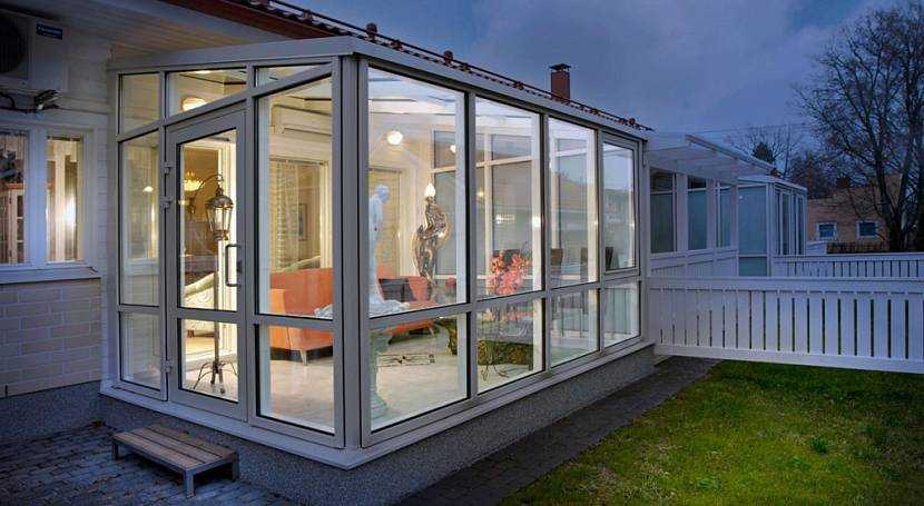 - каркас из дерева или металла с обычными окнами или стеклопакетами;