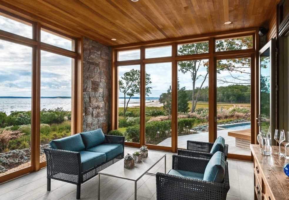 Как правило, остекляют периметр террасы и вход на нее. Окна для контура обычно выбирают глухие – но тут все зависит от пожеланий заказчика.