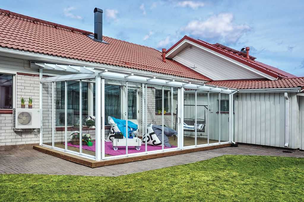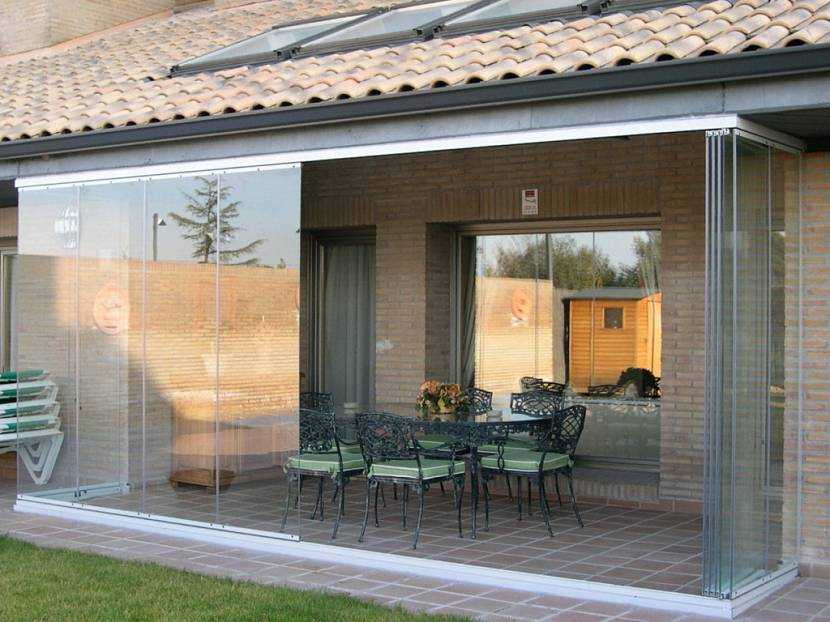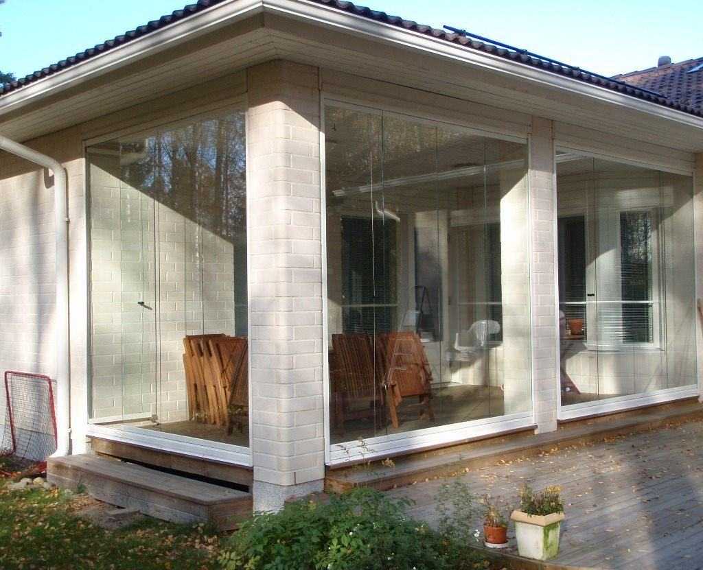 - безрамное остекление – например, раздвижное остекление веранды и террасы (стеклянные плиты на роликах, которые можно смещать в стороны, делая террасу открытой и закрытой);