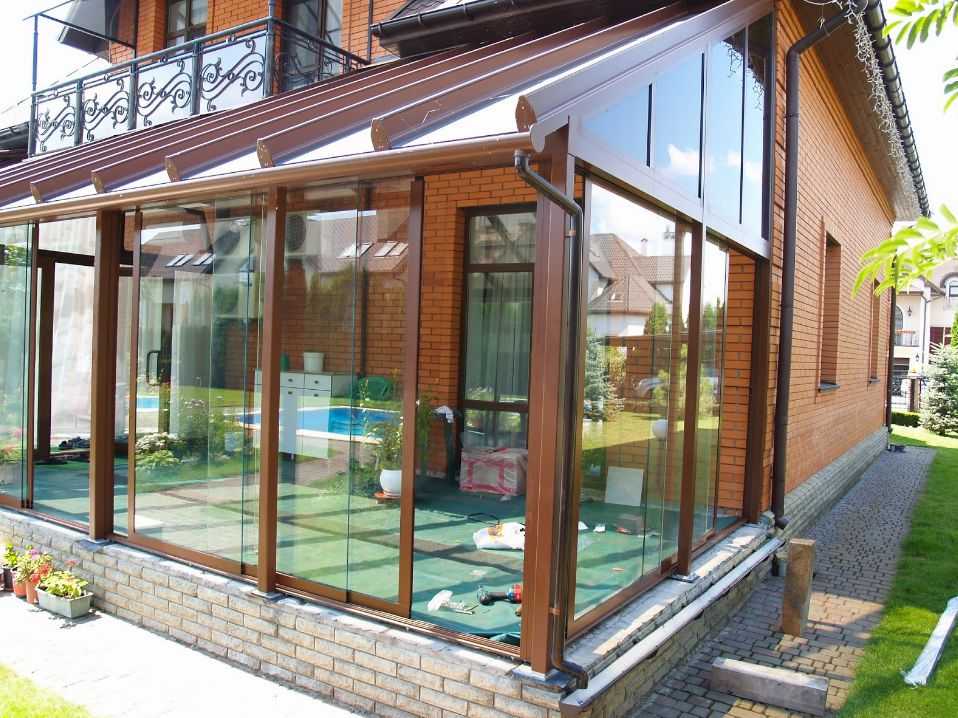 Алюминиевый каркас позволяет остеклять постройки любых габаритов и форм. По сути, делается помещение, стенами в котором являются глухие пластиковые окна – особенно эффектно смотрится безрамное остекление, для которого используется закаленное стекло толщиной до 12 мм и мощные створчатые профили. Их размеры могут доходить до 3 м и иметь любую форму. Это позволяет получить эффект расширения свободного пространства и достигается широкий внешний обзор.