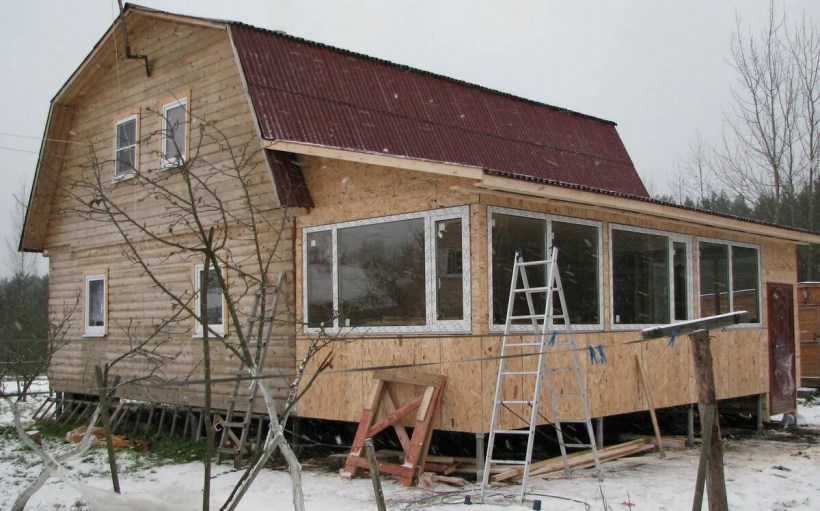 - Зашиваем каркас материалами, которые будут держать тепло и подходить к основному зданию. Изнутри это может быть фанера, а поверх нее – вагонка, снаружи – сайдинг или дерево. Но обязательно между ними проложить слой утеплителя и гидроизоляционную пленку (с обеих сторон от утеплителя), чтобы в него не проникала влага с улицы и пар изнутри. Не забудьте оставить оконные проемы.