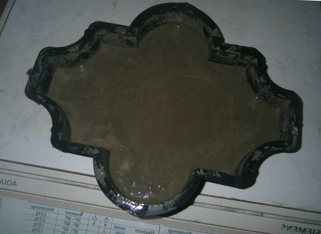 Форму для брусчатки предварительно смазывают растительным маслом и устанавливают на вибростол. Если плитка одноцветная, то смесь заливают до максимальной отметки в матрицу. Если же вы делаете двухцветное покрытие, то первым делом заливают окрашенную смесь.