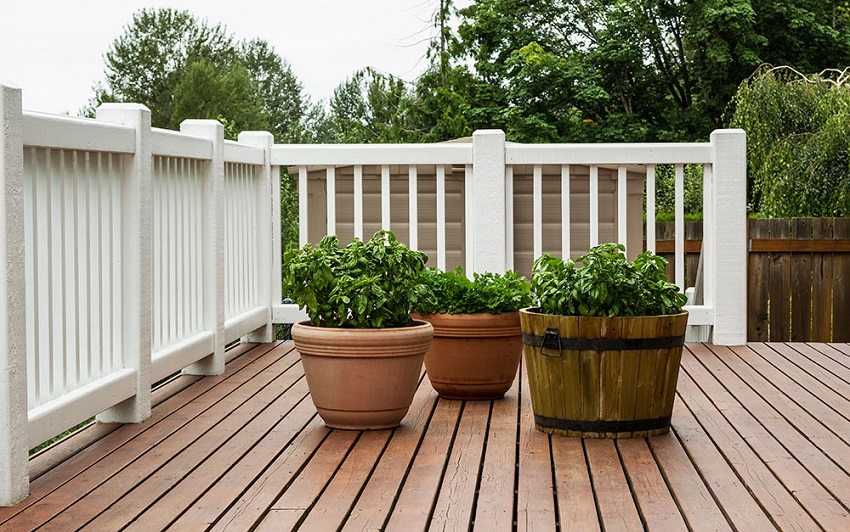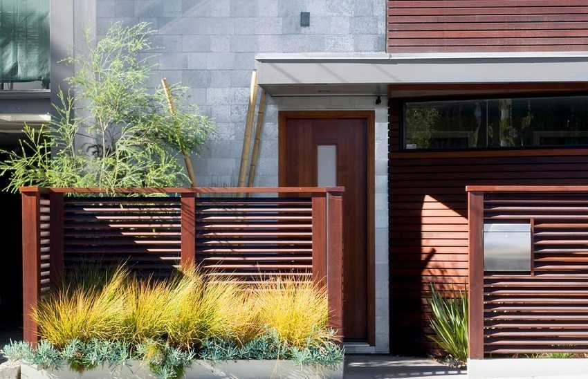 Деревянное ограждение с тонкими рейками в секциях и основательными стойками