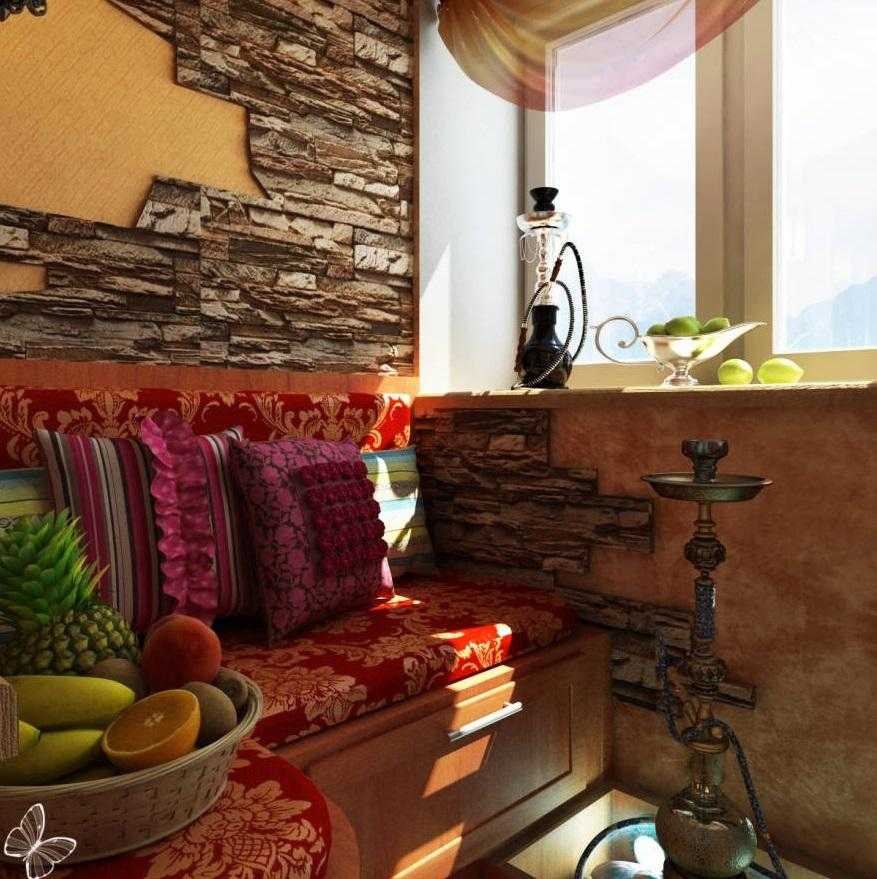 Для восточного стиля можно украсить бордюры и подоконники мозаикой, поставить кальян и низкий столик, разместить подушки или пуфы на полу.