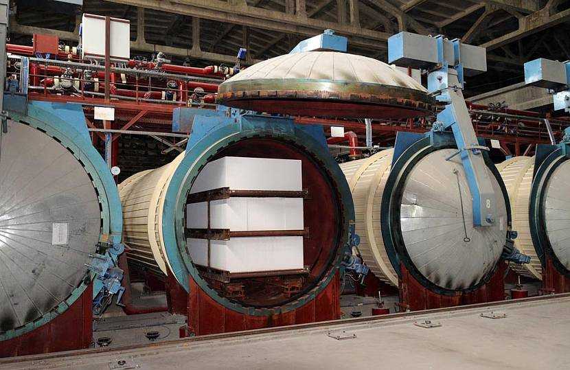 - Автоклавного (синтезного) твердения. Блоки набирают твердость (пропариваются) в автоклавах (приборах, создающих высокое давление в насыщенной водяным паром среде).