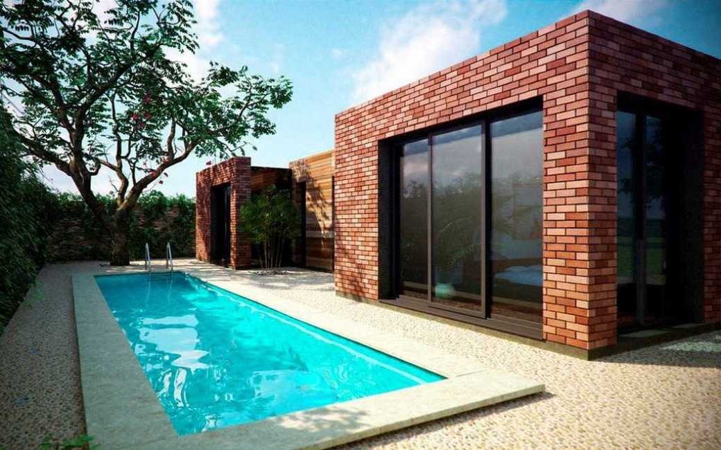 Квадратный дизайн как никогда популярен. Красные кирпичи производят сильное впечатление, добавляя тепло и очарование там, где могла стоять минималистская конструкция. В сочетании с широкими окнами и стеклянными дверьми, а также наружными жалюзи на них создается чудесный проект.