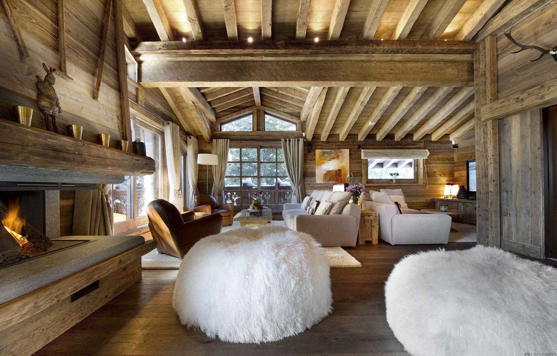 Для интерьера шале подойдет просторная комната с высокими потолками и панорамными окнами. Шкуры животных, массивная мебель и теплые ковры подчеркнут очарование стиля. Освещение может быть многоуровневым. Центральная люстра под старину (с имитацией свечей) будет создавать уют вместе с бра, настольными или напольными лампами с абажурами из натуральной ткани. Пример интерьера дома в стиле шале, фото просторной гостиной: