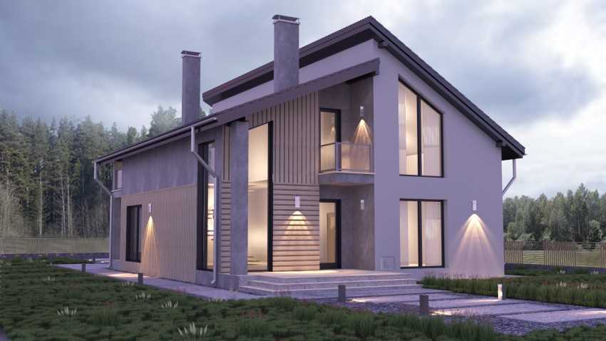В проекте современного коттеджа в европейском стиле акцент тоже сделан на светлую отделку фасадов. А темным деревом предлагается эффектно обозначить геометрию здания: выделить панелями из натуральной древесины стены и широкие кровельные свесы.