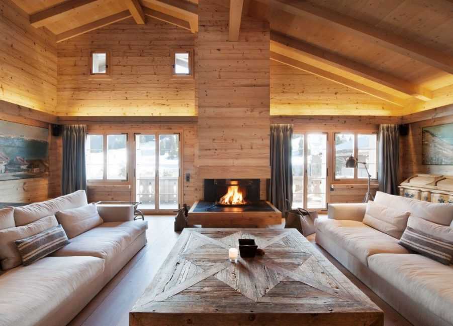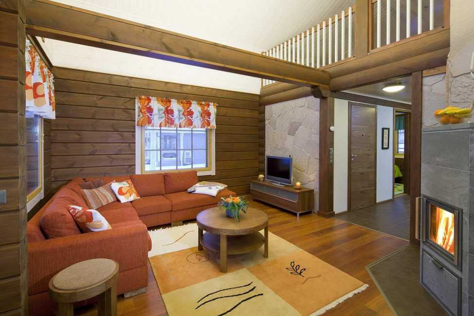 Натуральный материал не требует декоративной отделки, поэтому стены в домах из бруса оставляют открытыми, а интерьер «выстраивают» вокруг них. Удачно подчёркивают фактуру натурального дерева: