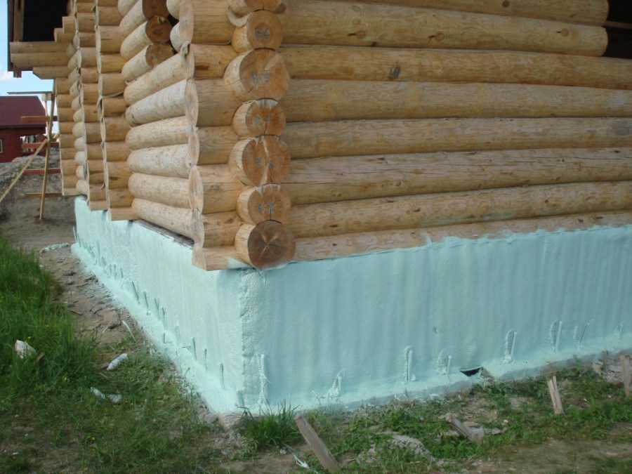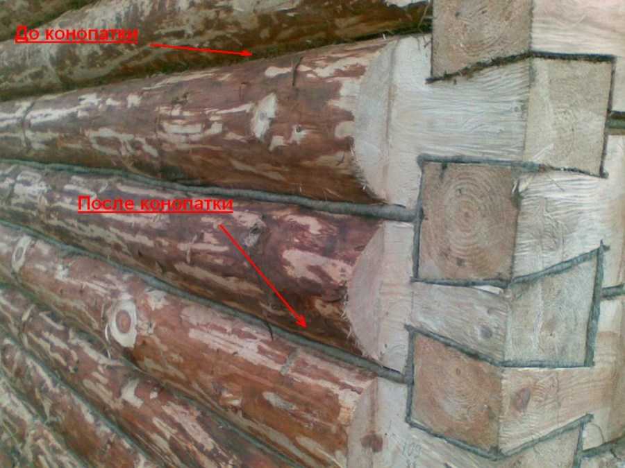 После того, как будет уложен первый ряд брёвен, на них сверху, достаточно толстым слоем, укладывается утеплитель: пакля, стекловата или мох. Утеплитель укладывается таким образом, чтобы после наложения на него верхнего ряда брёвен, его концы свисали бы хотя бы до половины предыдущего бревна. По завершении укладки сруба и возведения крыши, пазы между брёвнами следует проконопатить.