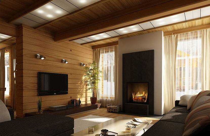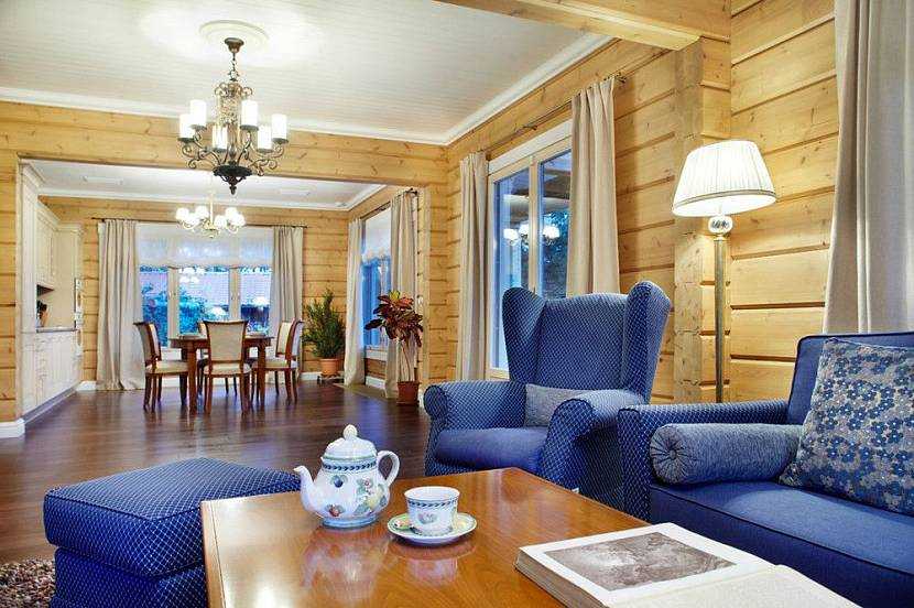 Интерьер гостиной в доме из брусаИсточник roomester.ru