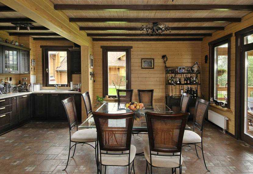 Интерьер кухни, совмещенной со столовой в деревянном домеИсточник 24stroydom.ru