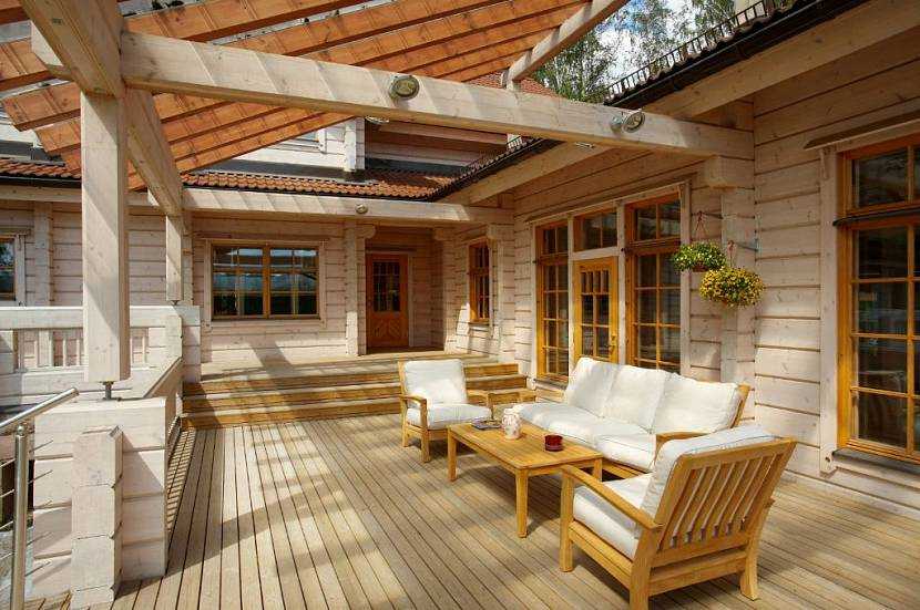 Интерьер открытой террасы в доме из брусаИсточник arhitectyra.ru