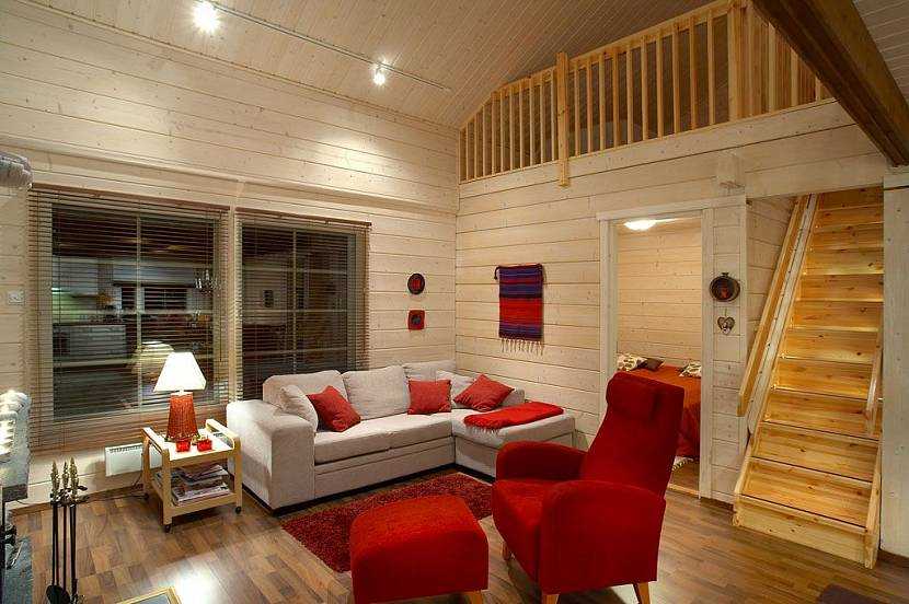 Характерный «финский» стиль интерьера — белые стены (белёный дуб, ясень), дополненные мебелью ярких оттенков. Оригинальный вариант — комбинация светлых стен и балок шоколадного оттенка.