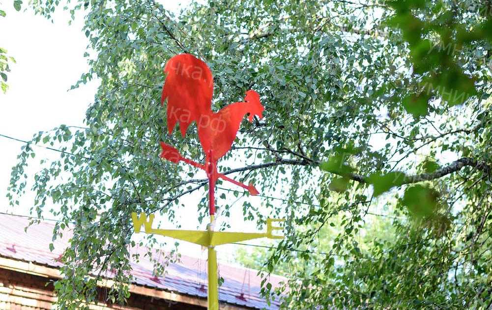 Флюгарка на нашем флюгере выполнена в виде алого петушка на стреле. В англоязычных странах флюгер так и называют «weather cock», что буквально означает «погодный петух». Петух традиционно считали символом бдительности. Своим криком петух не только возвещал о наступлении нового дня, но и, по народным поверьям, предупреждал болезни и пожары, отваживал от дома воров и служил оберегом от нечистой силы.