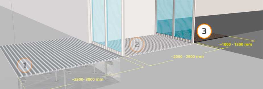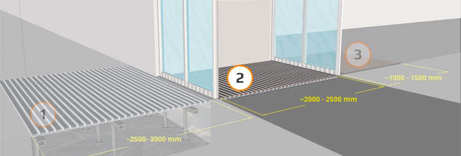 Для большей эффективности тамбурной зоны желательно, чтобы покрытие занимало всю длину тамбура в направлении движения пешеходов от наружной двери в помещение к внутренней, не менее 1,5-2,5 метров. По ширине она должна перекрывать всё пространство для движения пешеходов.