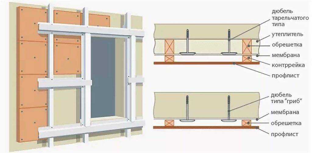 Чтобы качественно утеплить стены постройки, между профилями обрешётки рекомендуется уложить утеплитель (пенопласт, базальтовую либо минеральную вату). Выбор утеплителя зависит от климатических условий на территории, где находится дом.
