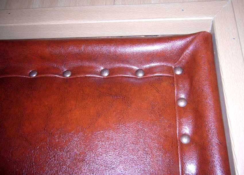 Последний этап – обтянуть дверь дерматином, закрепляя подогнутые края гвоздями. При желании формируют рисунок декоративными крепежами.