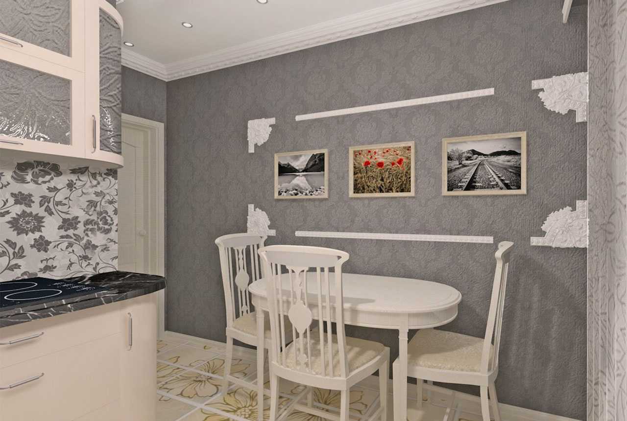 На фото пример маленького зала, в котором на стенах скомбинированы обои из одной коллекции. Акцентная стена выделена обоями с орнаментом.