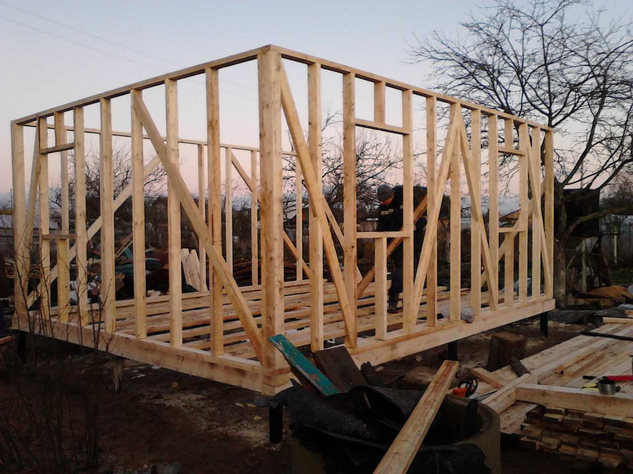 Сборка каркаса. Как писалось выше, его обустроить можно из деревянного либо металлического материала. Вариант с использованием металла предпочтительнее из-за своей надежности, но является более дорогим. Помимо этого, для каркаса из металла нужен более прочный фундамент. С внешней стороны на каркас закрепляется доска или вагонка.