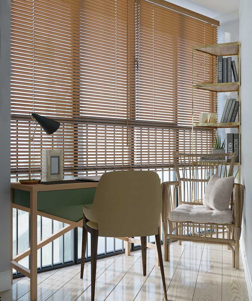Еще одним популярным вариантом оформления балконных окон становятся жалюзи. Благодаря специальным пропиткам они прослужат гораздо дольше своих сестричек из простых тканей.