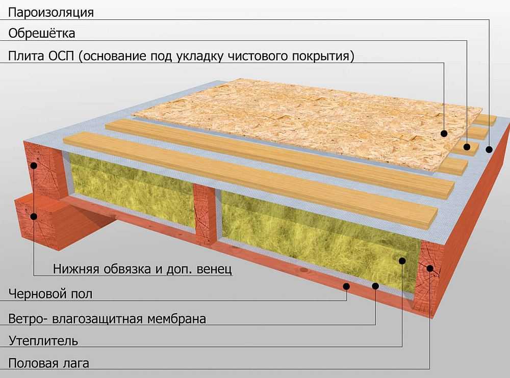 Если вы хотите обойтись без использования цемента для обустройства полов (причиной тому может быть проведение строительных работ зимой), то можно обустроить деревянные полы по лагам. Для этого необходимо на обрешетку, между промежутками которой надо уложить утеплитель, монтировать листы ОСБ.