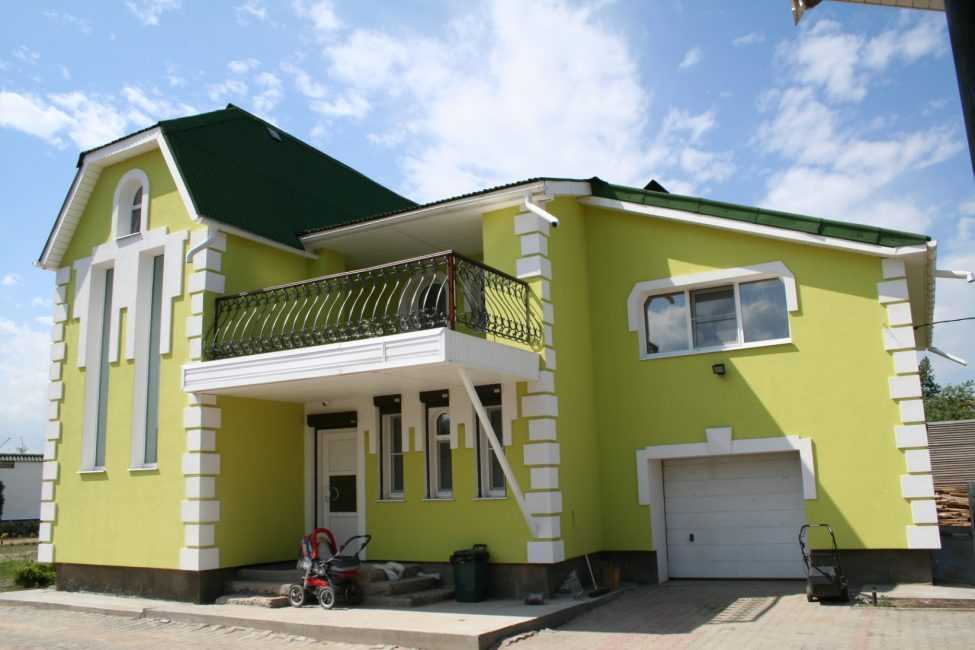 Обратите внимание на почти полное совпадение оттенков фундамента с крышей. Окрашивание стен белым и салатовым цветом