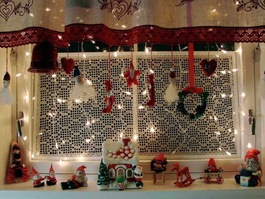 Это тоже простой вариант оформления окон. Ведь ажурные салфетки очень сильно напоминают снежинки.