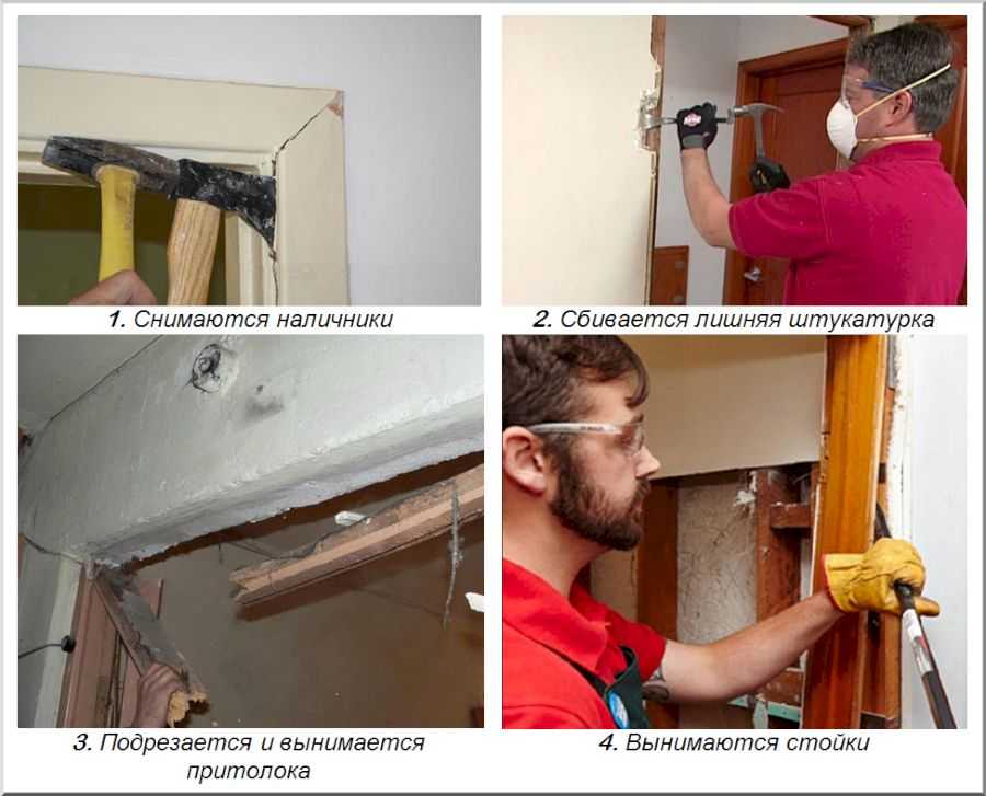 - Когда притолока снята, поддеваете топором и вытаскиваете боковые стойки;