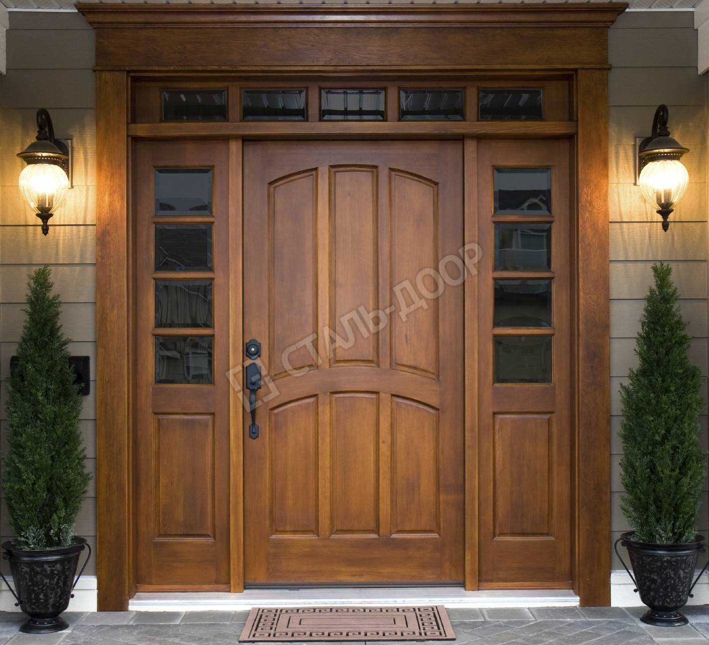 Входная дверь в коттедж из массива с фрамугой