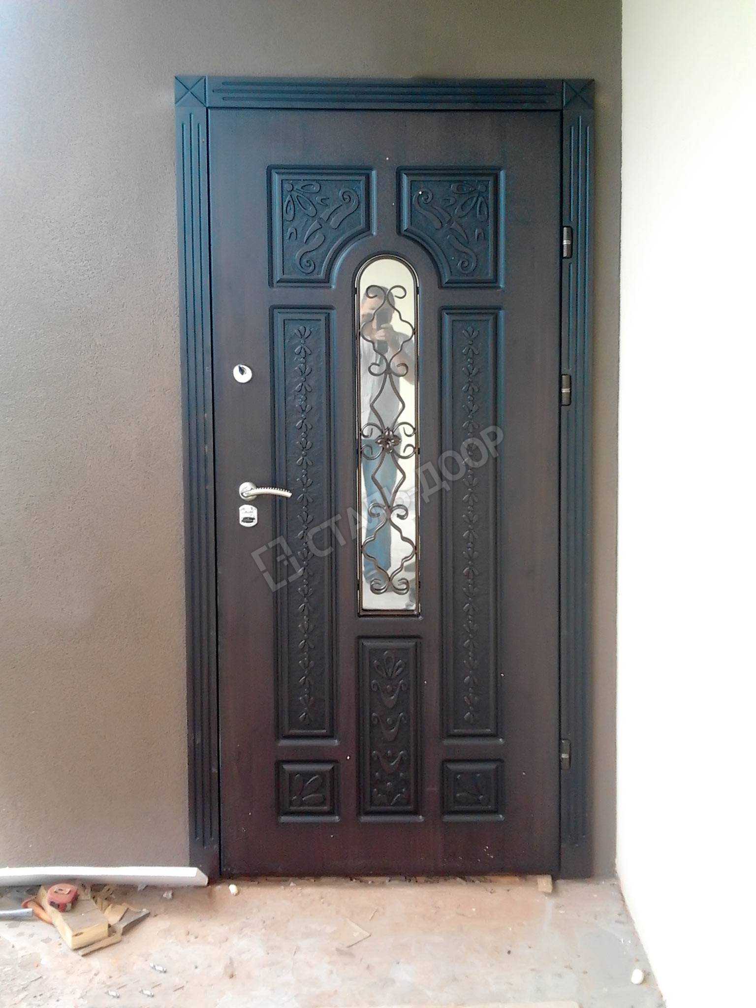 Массивная арочная дверь в частный дом со стеклом и ковкой