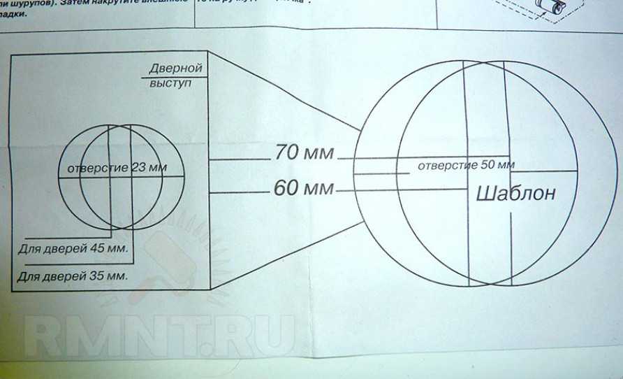 Начнем с разметки, отверстие на дверном полотне под ручку отмечаем на расстоянии 1 м от пола, а также учитываем необходимое расстояние от края(смотрим по защелке), на заводских упаковках часто присутствует лекало для разметки.