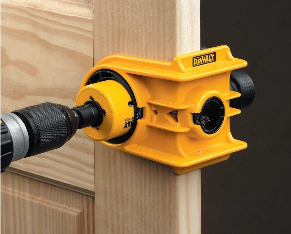 Друзья, когда будете сверлить отверстие под врезку замков в межкомнатную дверь ни в коем случае не давите на сверло или коронку (если вы устанавливаете ручку — кноб). Все дело в том, что при сильном нажатии вы рискуете вырвать кусок двери в выходной стороне сверла, поэтому сверлить необходимо потихоньку, регулируя прижим.