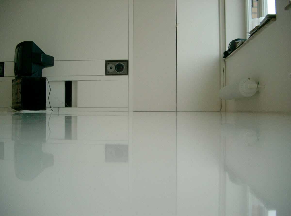 Сделать такой пол можно глянцевым или матовым. Первый просто сверкает своей новизной и необычностью, но на нем будет заметна каждая пылинка. Не забудьте также о том, что он будет и отзеркаливать всю мебель, так что чистого белого цвета все-таки не получится. А вот матовый куда более практичен в использовании.