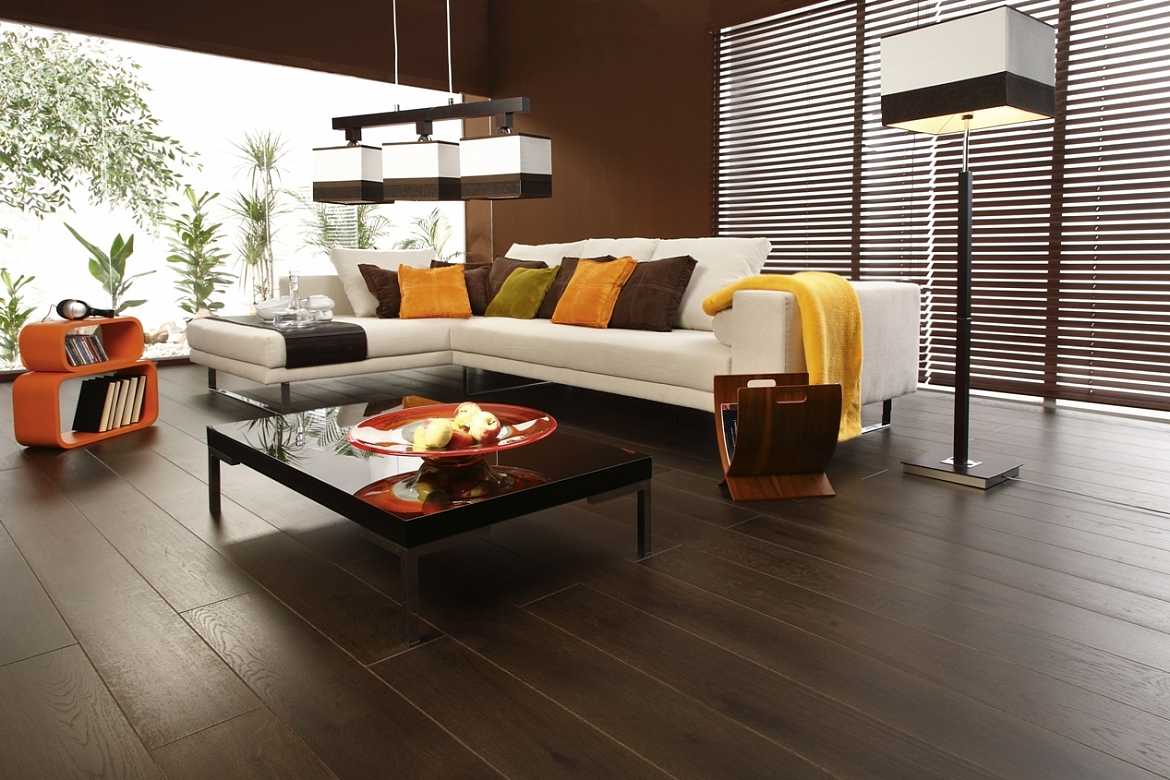 Виниловая плитка представляет собой разрезанный на отдельные части ПВХ-линолеум. Многие свойства материал унаследовал от обычного линолеума: стоимость, прочность, простота в уходе, звукоизоляция. Поверхность такого покрытия нескользкая, может выдержать недлительное воздействие влаги, а уж возможных вариантов цвета и текстуры – огромное количество, поэтому гостиную можно будет выполнить в любом стиле.