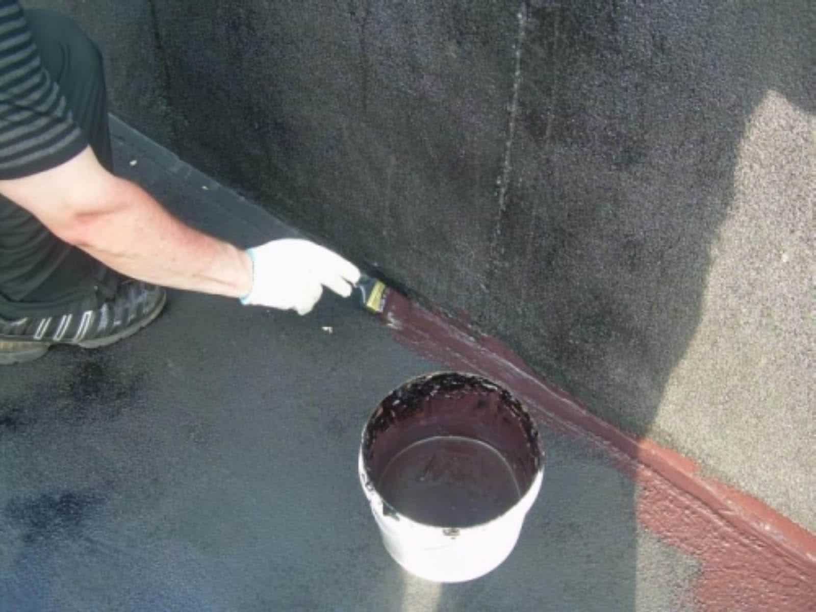 Если владелец помещения желает ускорить ремонтные работы, то он может сделать изоляцию из жидкой мастики. Материал обладает низкой стоимостью и долговечностью. Гидроизолирующий раствор наносится малярной кистью или валиком в несколько пластов с промежуточной сушкой. Время затвердевания слоев составляет от 4 до 12 часов (зависит от типа растворителя и производителя мастики).