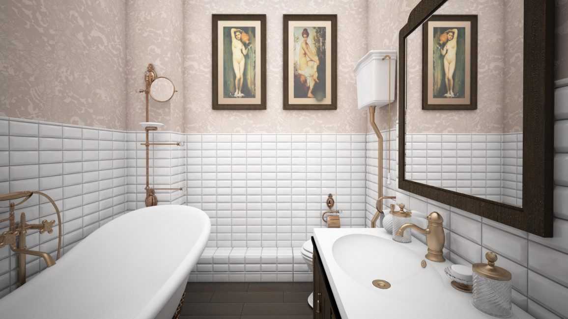 - Постельные и телесные тона станут неплохим решением при реализации в интерьере ванной комнаты классического стиля. При выборе стиля прованс можно использовать моющиеся обои с миниатюрным цветочным принтом или вертикальными полосками.