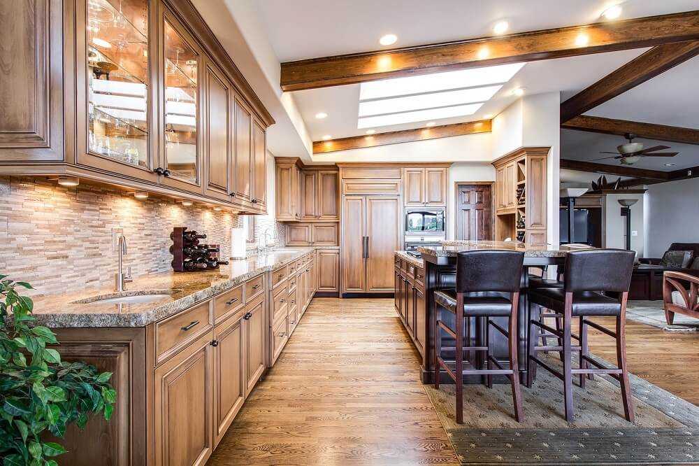 Это классическое исполнение дизайна кухонного пространства обычно содержит в себе цветовое зонирование – зона готовки отделяется от столовой более темными оттенками. Фиолетовые, желтые и розовые оттенки не способствуют аппетиту, в отличие от «шоколадной» палитры и красных цветов.