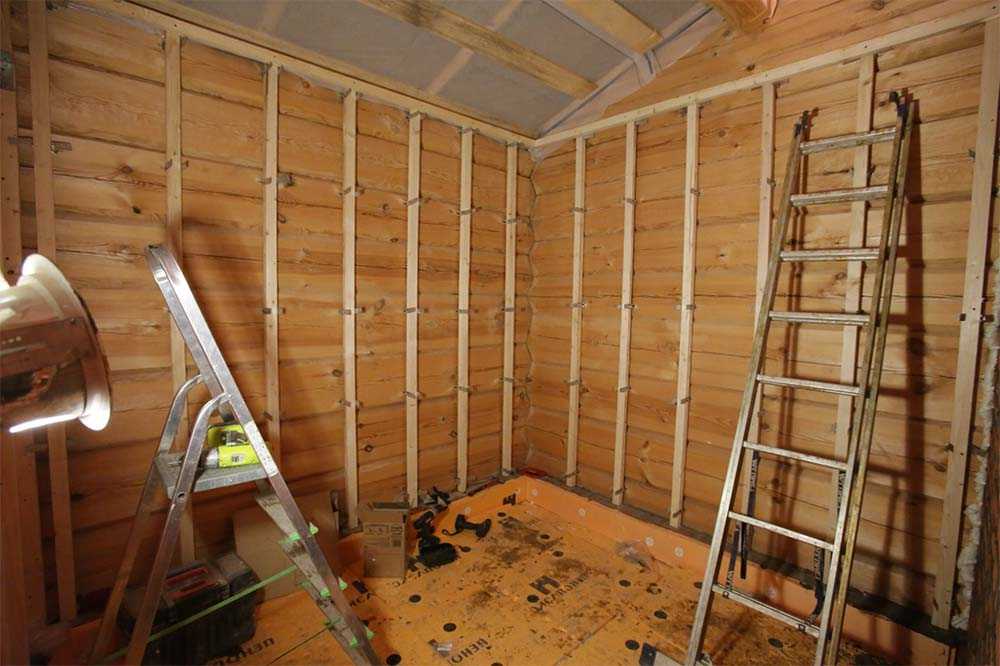 Задаваясь вопросом, как отделать баню внутри вагонкой, стоит учесть необходимость установки обрешетки. Чаще всего ее делают посредством брусьев из дерева. В определенной последовательности планки прикрепляют к стене, для чего служат дюбеля или саморезы.