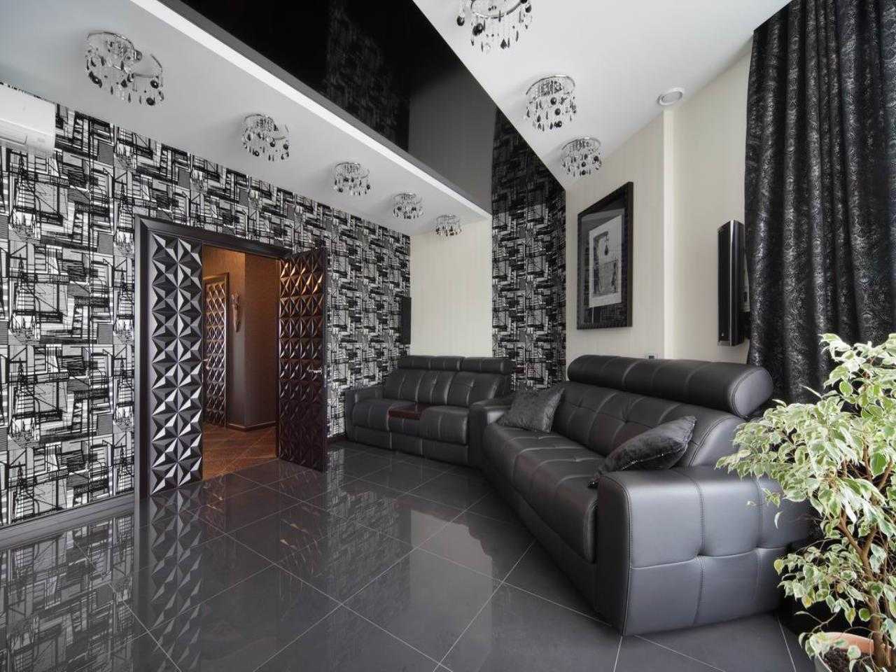 Выбор в пользу трехуровневых и четырехуровневых концепций применим для крупных комнат с высокими потолками. Зачастую черно–белые многоуровневые полотна применяют в комнатах делового стиля.