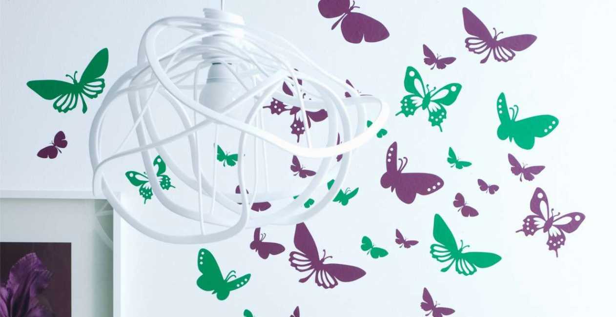 Здесь точно также можно поискать шаблоны бабочек на стену, и на их примере вырезать наклейки. Эти пленки бывают самых разных расцветок, а глянец их покрытия будет красиво переливаться в искусственном свете комнаты.