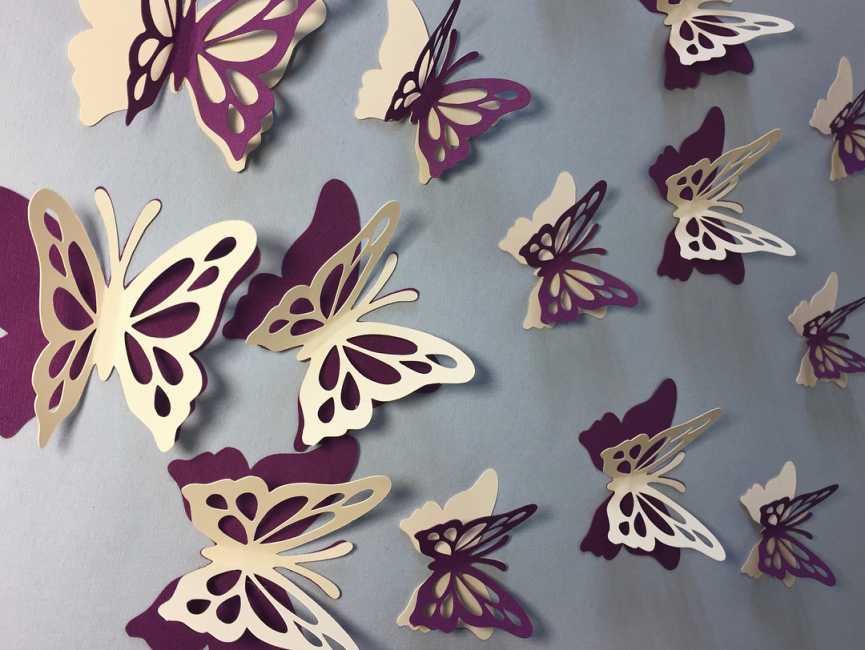 Точно также можно поступить и с бабочками. Поищите заготовки, на примере которых вы можете создать свою собственную бабочку из бумаги на стену, и творите.